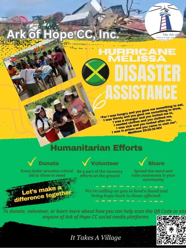 I hope this message finds you well. As you may know, Hurricane Melissa has caused devastating damage across Jamaica, leaving many families without homes, food, and basic necessities. The road to recovery will be long, but together we can make a real difference. Partnering with Ark of Hope Community Center Inc., a trusted organization committed to providing relief and rebuilding efforts for those affected is how you can help. We are asking for your support—whether through donations, volunteering, or simply spreading the word. Every contribution, big or small, brings hope to those in need.